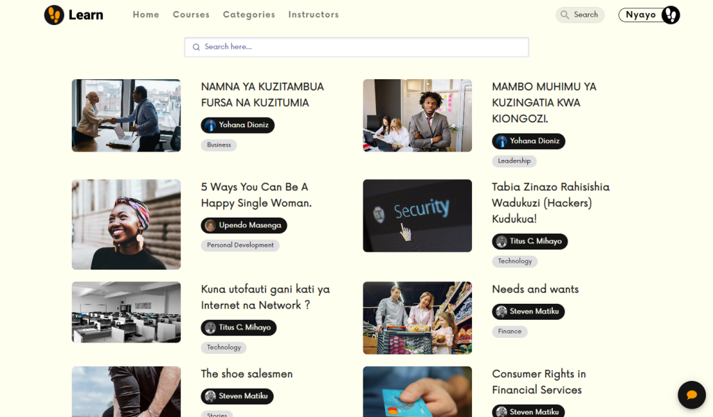 Learn allows users to buy and sell knowledge content. As an instructor, you can share what you know and get paid for it. As a learner, you can learn about business, finances, relationships, leadership, and more, to add value to your life. Learn is part of our Product lines here at NyayoZangu, and serves to live up to our motto: Sharing Experiences And Opportunities.